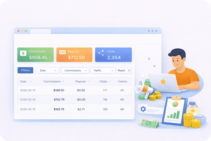 Kartivo gives your affiliates the ability to view and generate reports on commissions, payouts and traffic