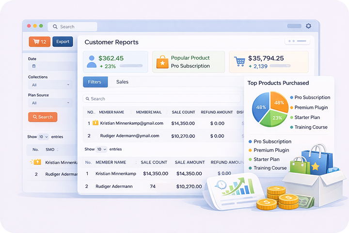 Get reports and important key metrics about your customers buying habits. For example, see how much they spend on average and which products they buy the most.