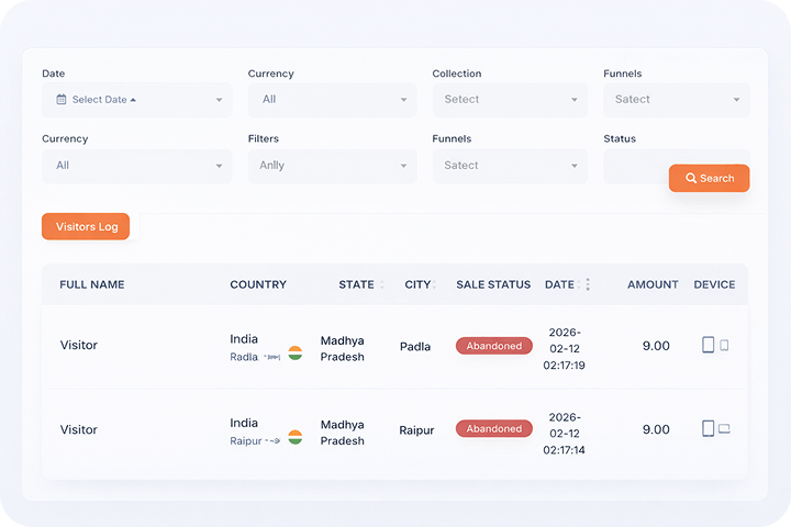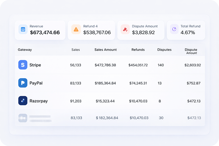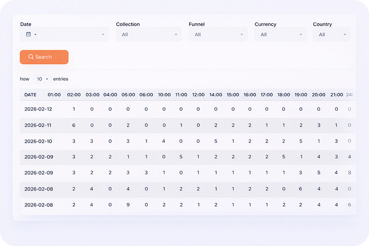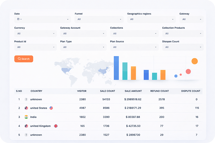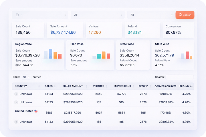 Track sales, visitors, refunds, and disputes by country and region. This view helps you identify top-performing markets, spot high-refund regions, and optimize targeting based on real conversion data.