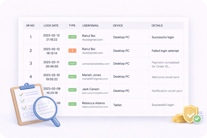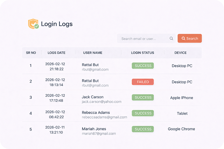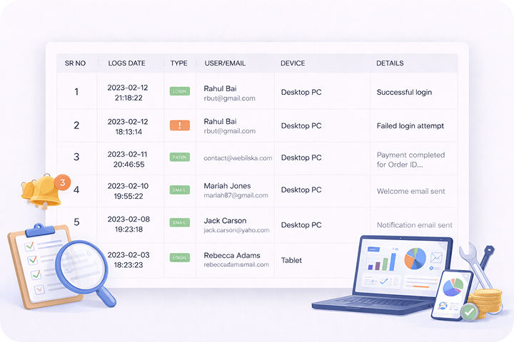 View all emails sent from the platform, including onboarding messages, notifications, and transactional emails. Each log captures delivery details, email type, recipient, subject, and timestamp—making it easy to verify communication or resolve support issues.