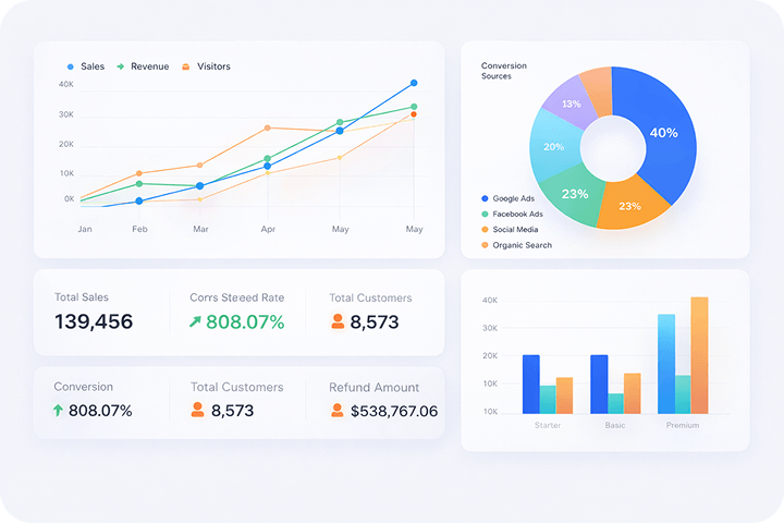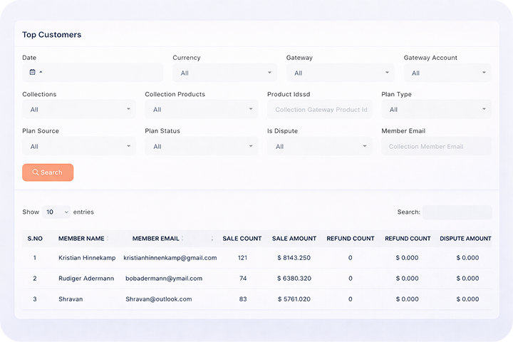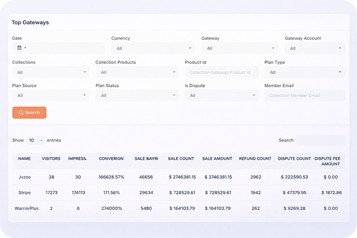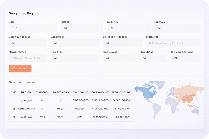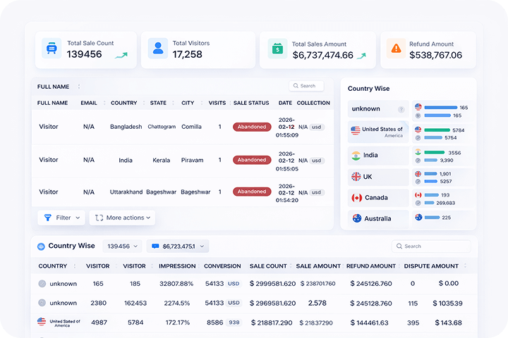 Track sales, visitors, refunds, and disputes by country and region. This view helps you identify top-performing markets, spot high-refund regions, and optimize targeting based on real conversion data.